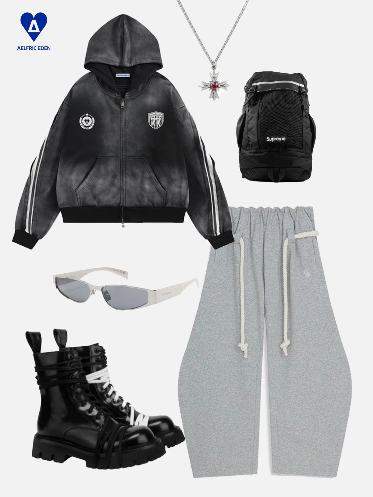 Crafted in a bold black acid-wash finish. this statement zip-up features dual zipper closure. varsity-style badge logos. and contrasting athletic stripes down both sleeves. The oversized fit and structured hood bring a retro-sport meets street-ready aesthetic.