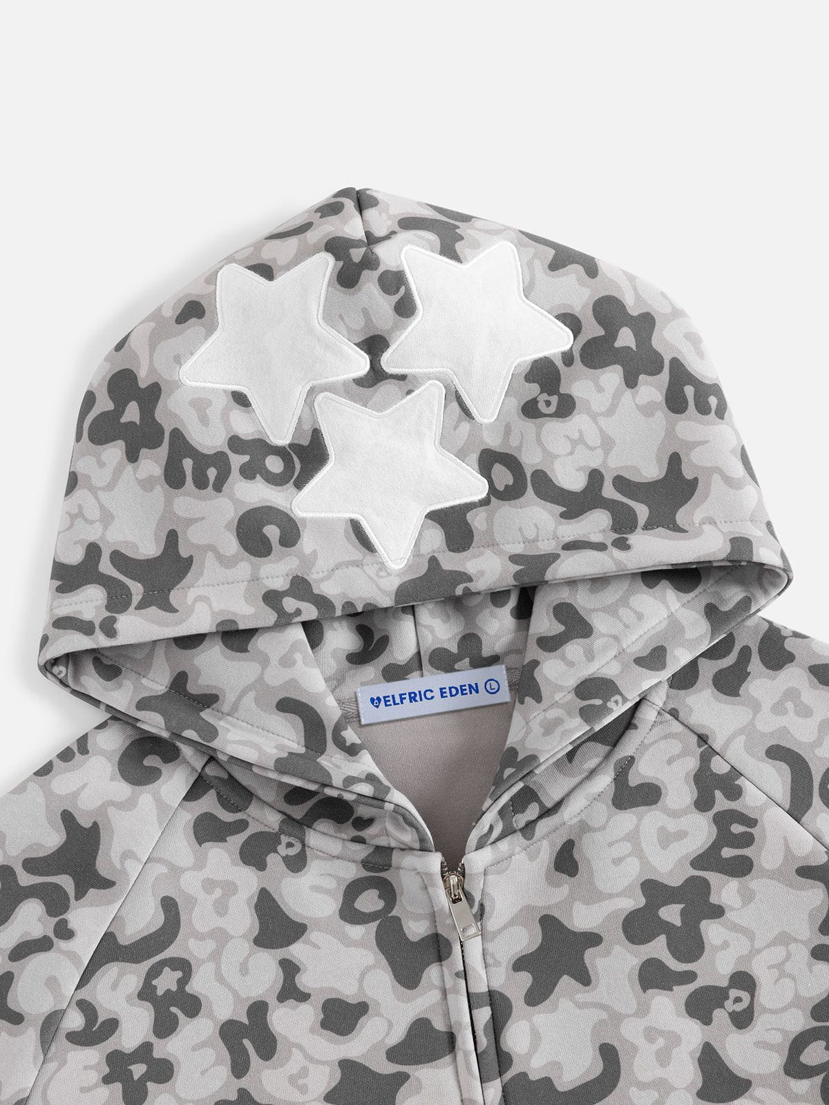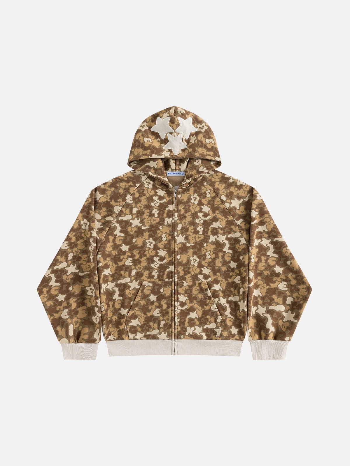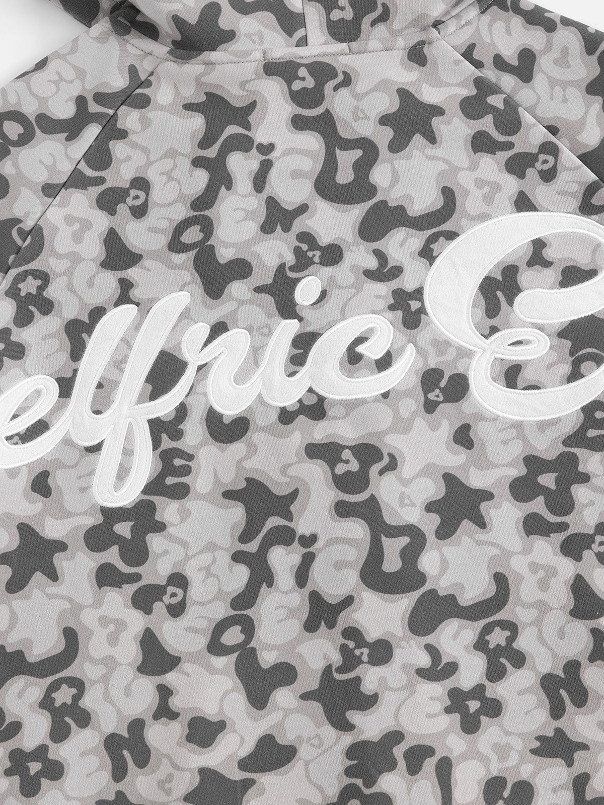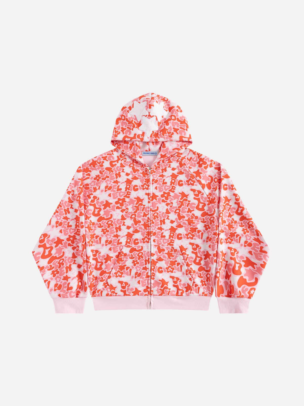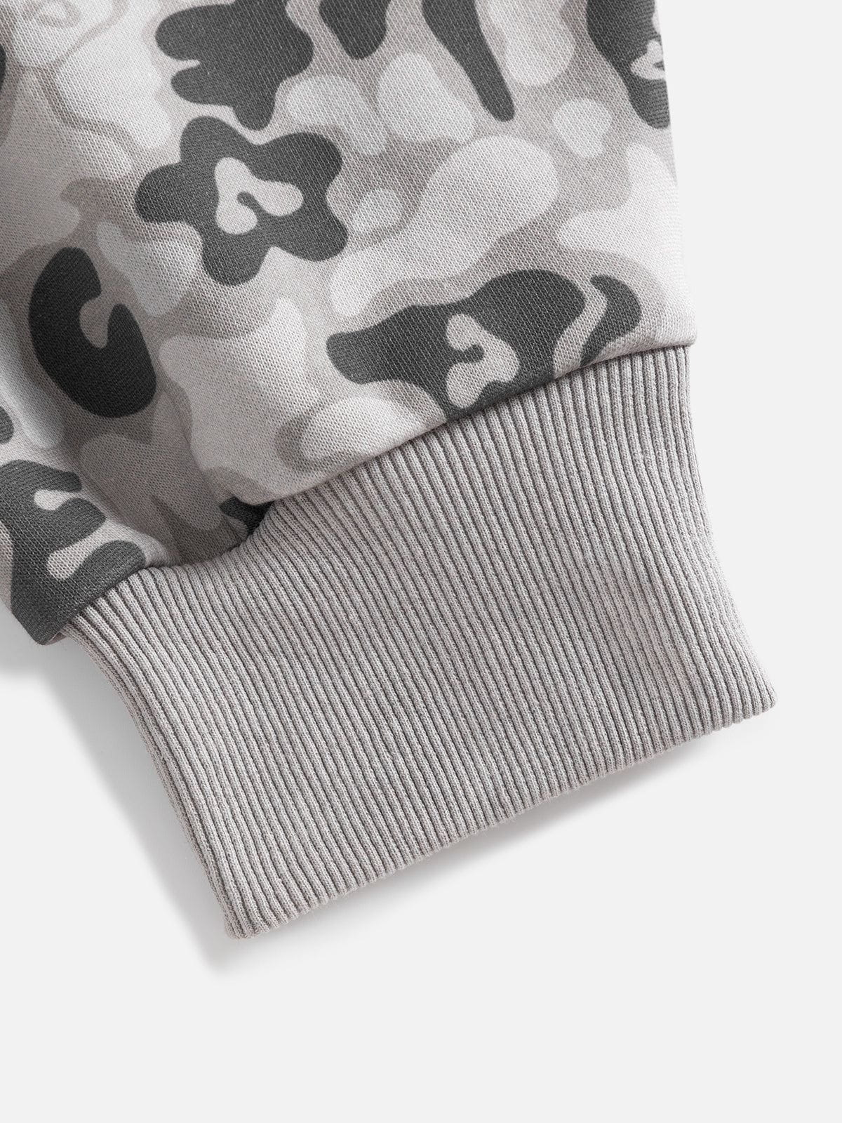 This zip-up hoodie features raglan sleeves and a full-print camo graphic design. combining comfort with bold style. The raglan sleeve offers enhanced mobility. while the all-over pattern adds a dynamic. edgy look perfect for casual wear.