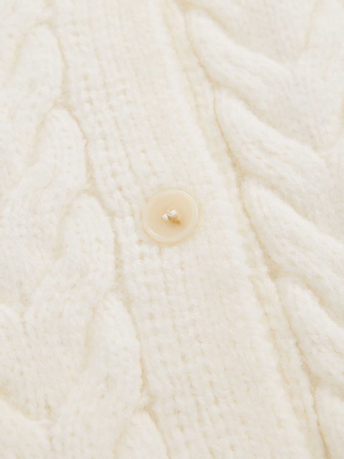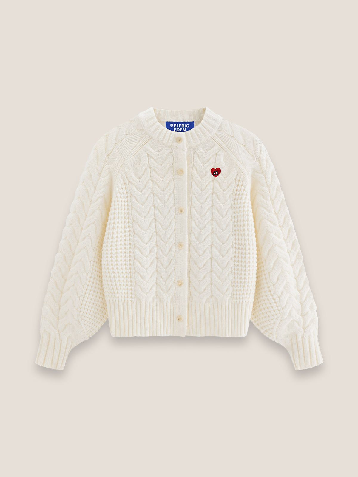 This classic white cable-knit cardigan is crafted from soft. cozy yarn in a relaxed silhouette that layers effortlessly. The standout detail? A bold red heart logo embroidered on the chest and finished with neutral almond-toned buttons for a warm contrastadding a touch of charm and personality.