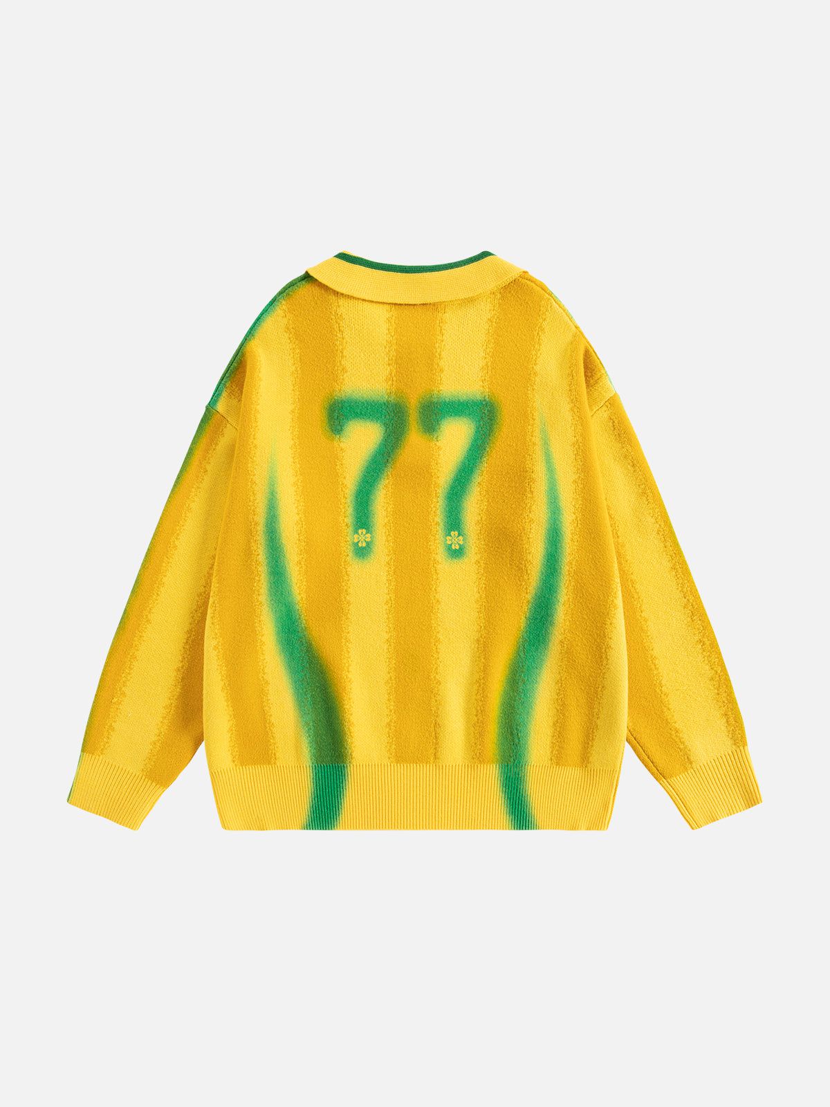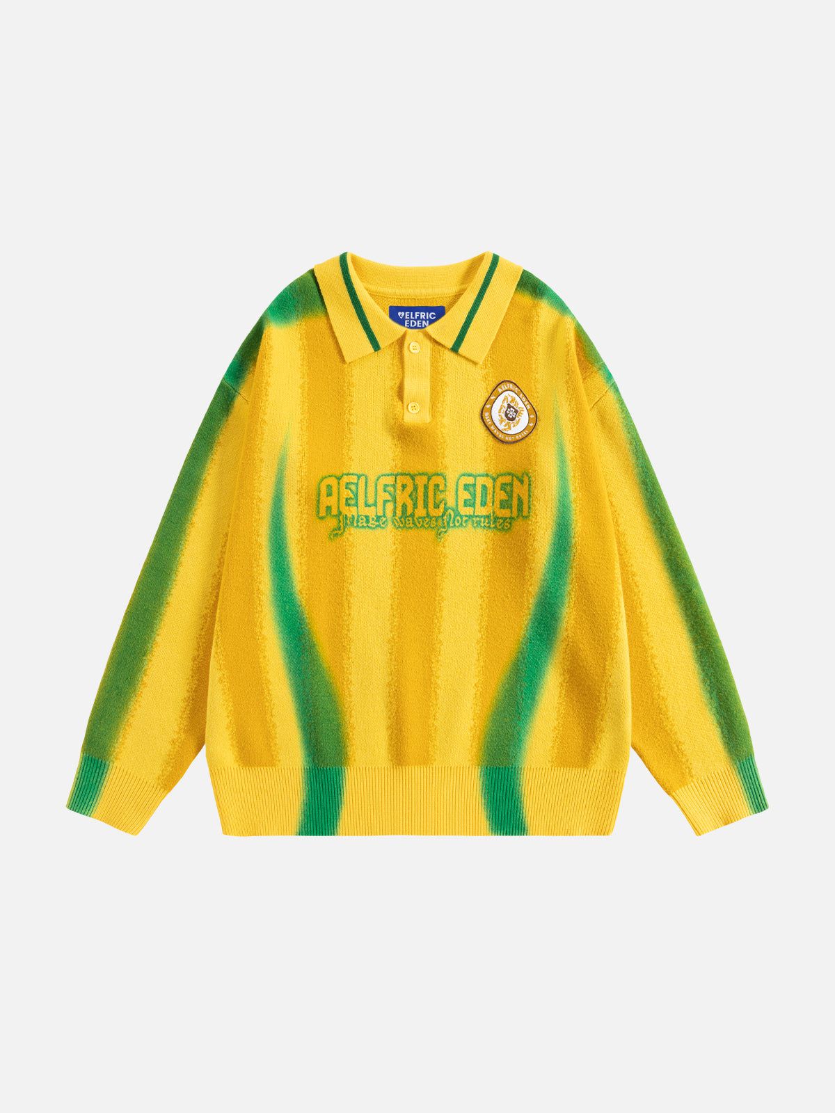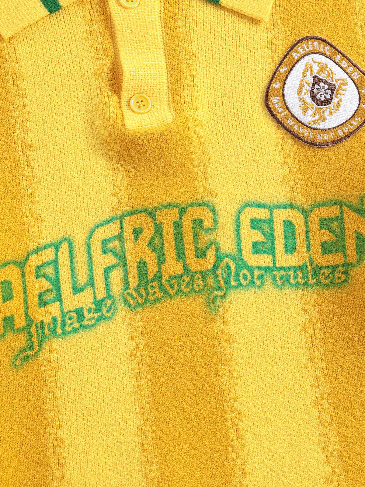 The Aelfric Eden Inkjet Print 77 Stripe Polo Sweater features a subtle blurred print that adds a soft. artistic touch to its vibrant stripes. Designed for both comfort and style. this sweater is perfect for adding a unique yet cozy element to your casual wardrobe.