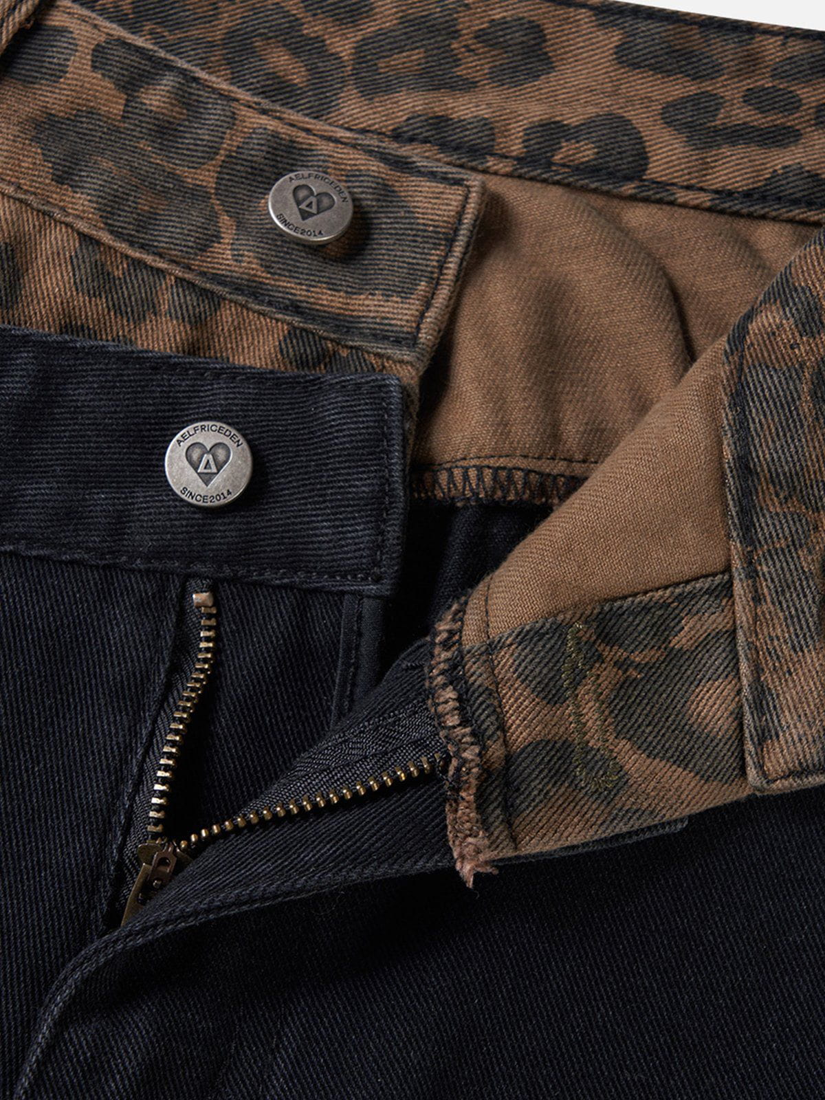 Discover Playful Elegance with our Aelfric Eden Leopard Double Waist Baaggy Jeans! Embrace the charm of Mushroom Village in these black denim jeans featuring a unique double waistband with a leopard print accent. Combining sleek black denim with a touch of wild flair. these jeans embody the whimsical yet stylish spirit of Aelfric Eden.