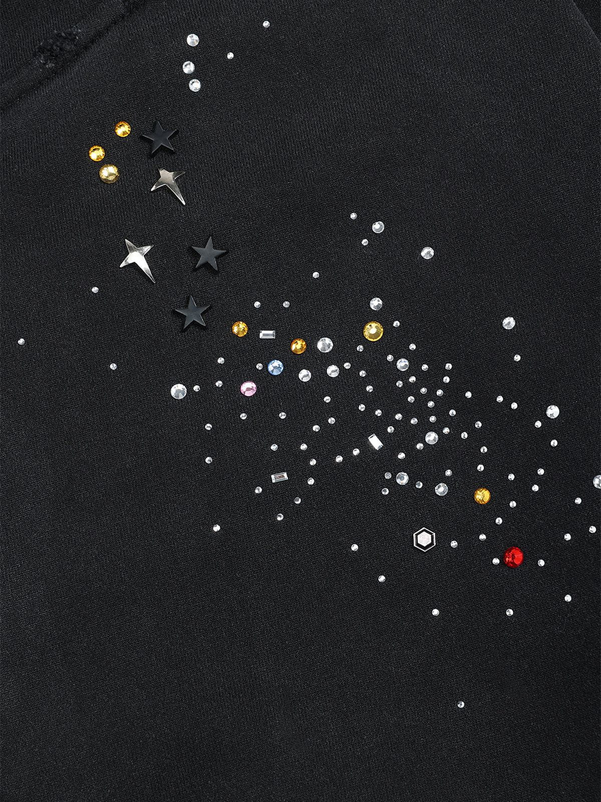 This cropped hoodie features sparkling rhinestone details that catch the light with every move. adding instant charm and making your look stand out. The dazzling accents break up the monotony of solid black. giving it a refined. eye-catching vibe. The short cut elevates the waistline. effortlessly elongating your legs for a flattering silhouette.