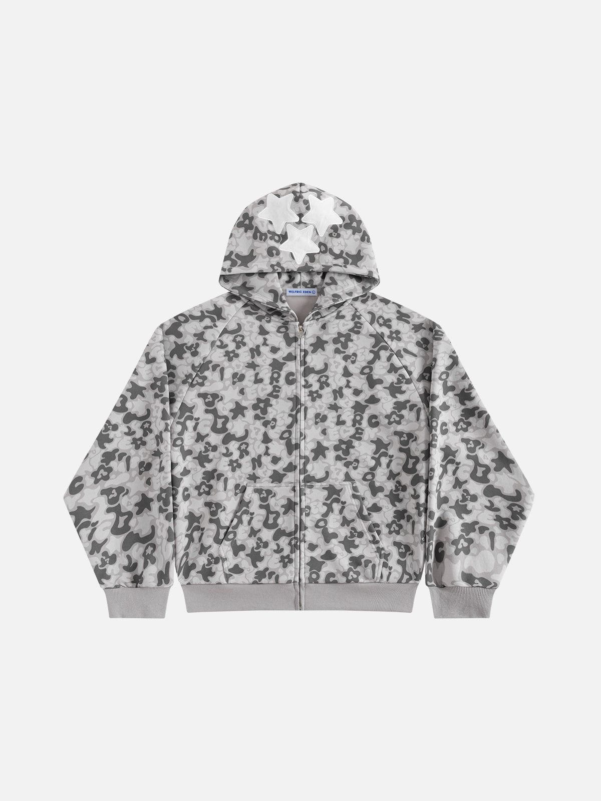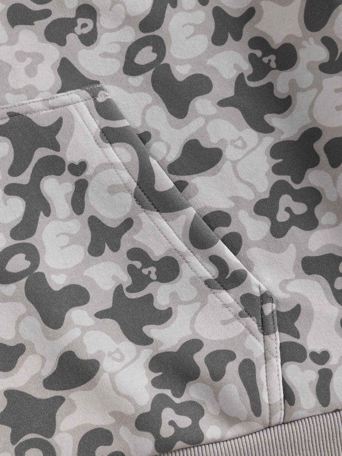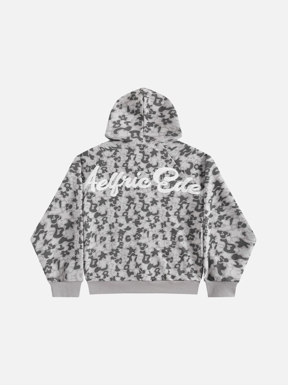 This zip-up hoodie features raglan sleeves and a full-print camo graphic design. combining comfort with bold style. The raglan sleeve offers enhanced mobility. while the all-over pattern adds a dynamic. edgy look perfect for casual wear.