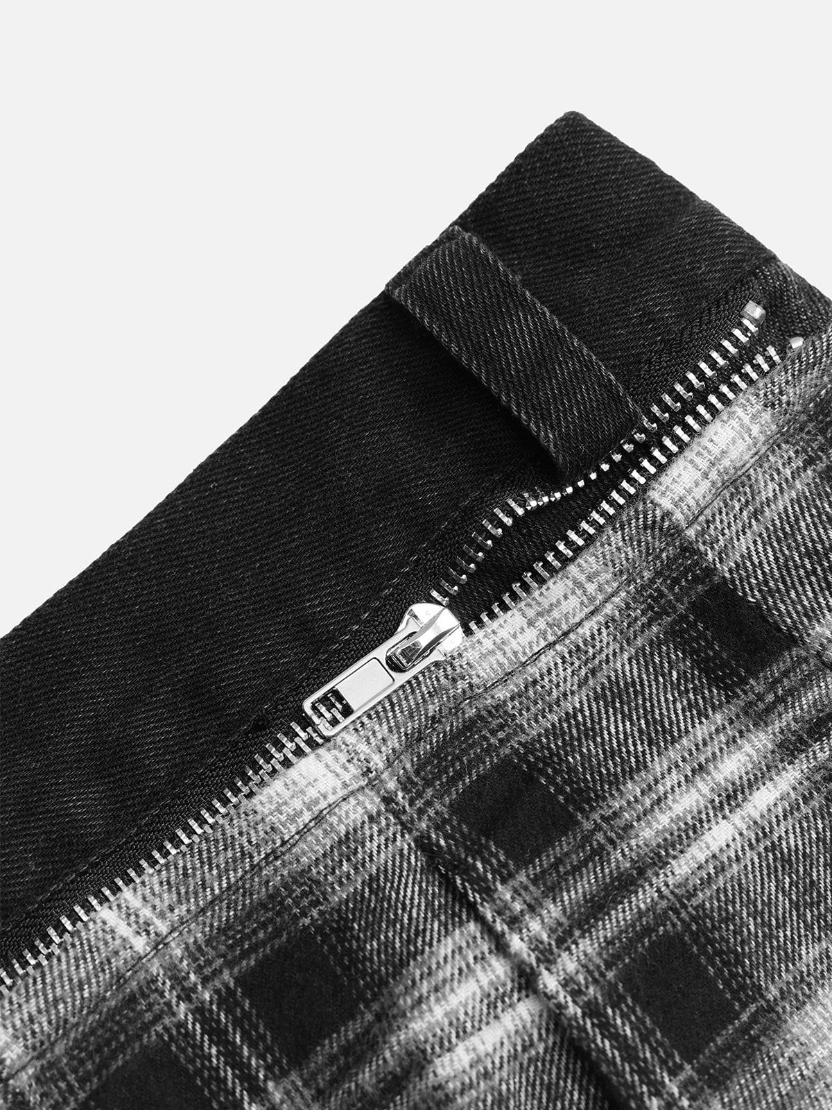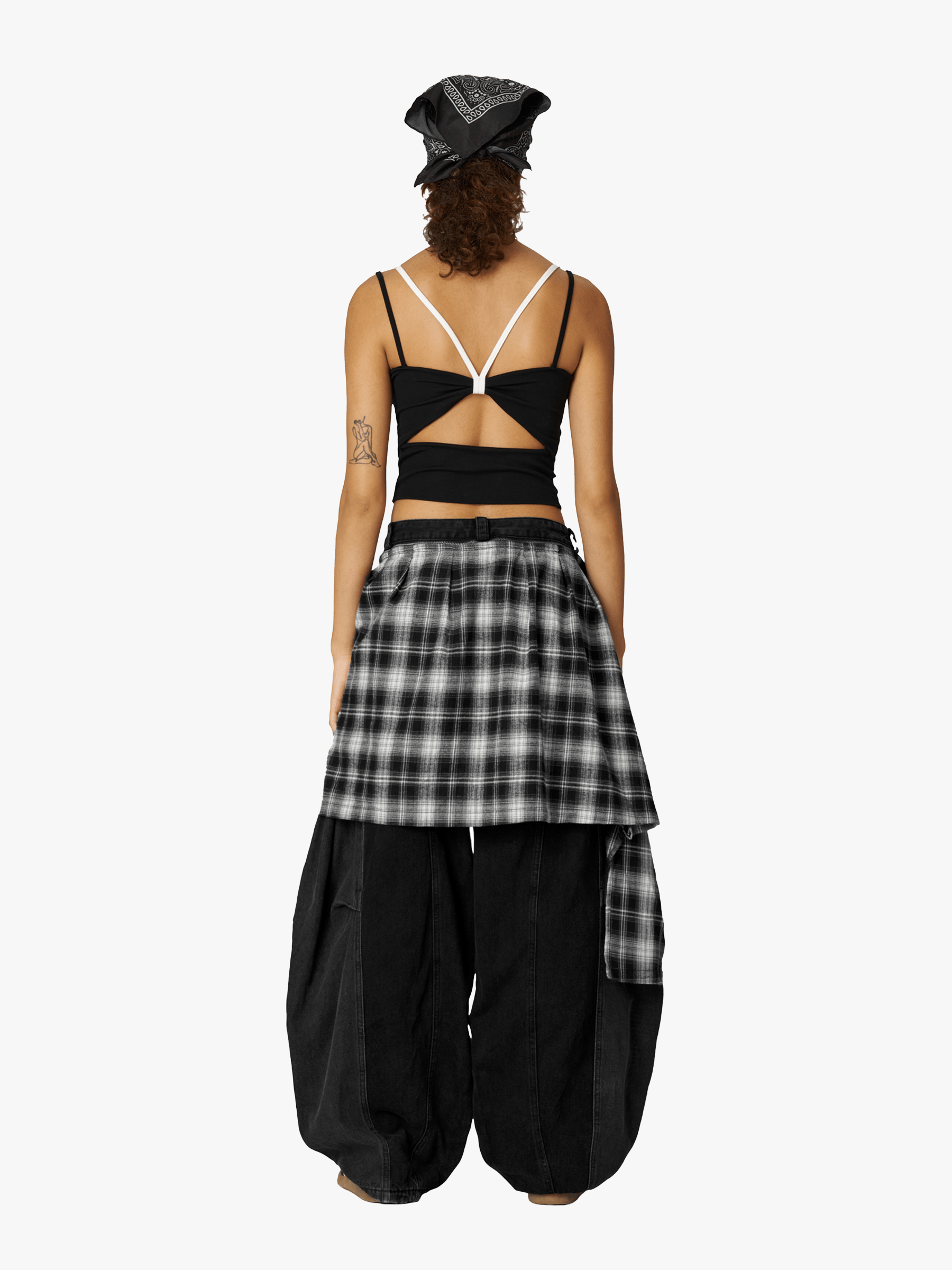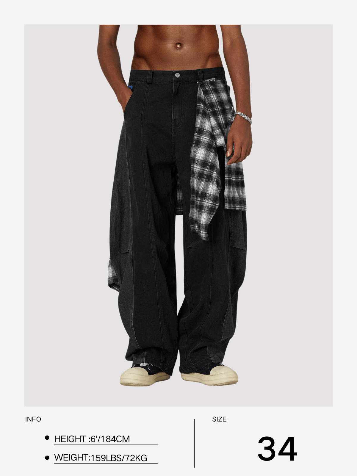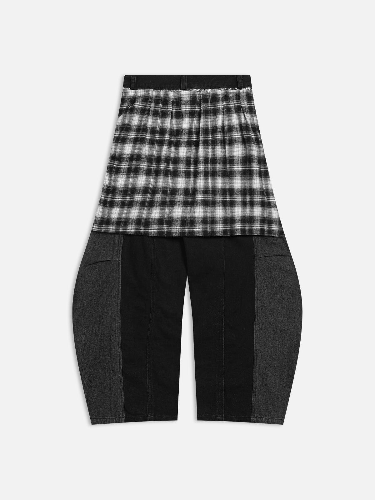 Plaid fabric is cleverly draped across the waist. creating a layered shirt-around-the-hip effect. These super baaggy black jeans blend grunge elements with streetwear volume. offering a bold. deconstructed silhouette from every angle.