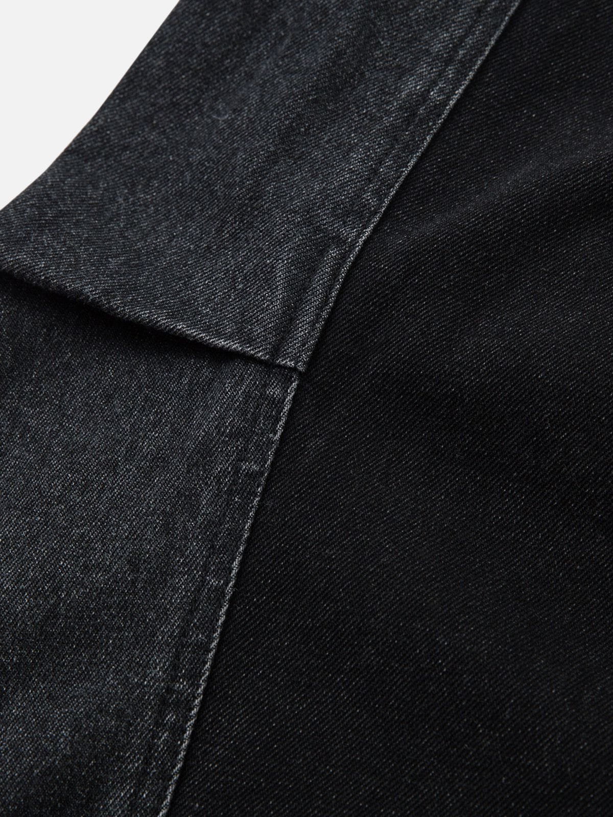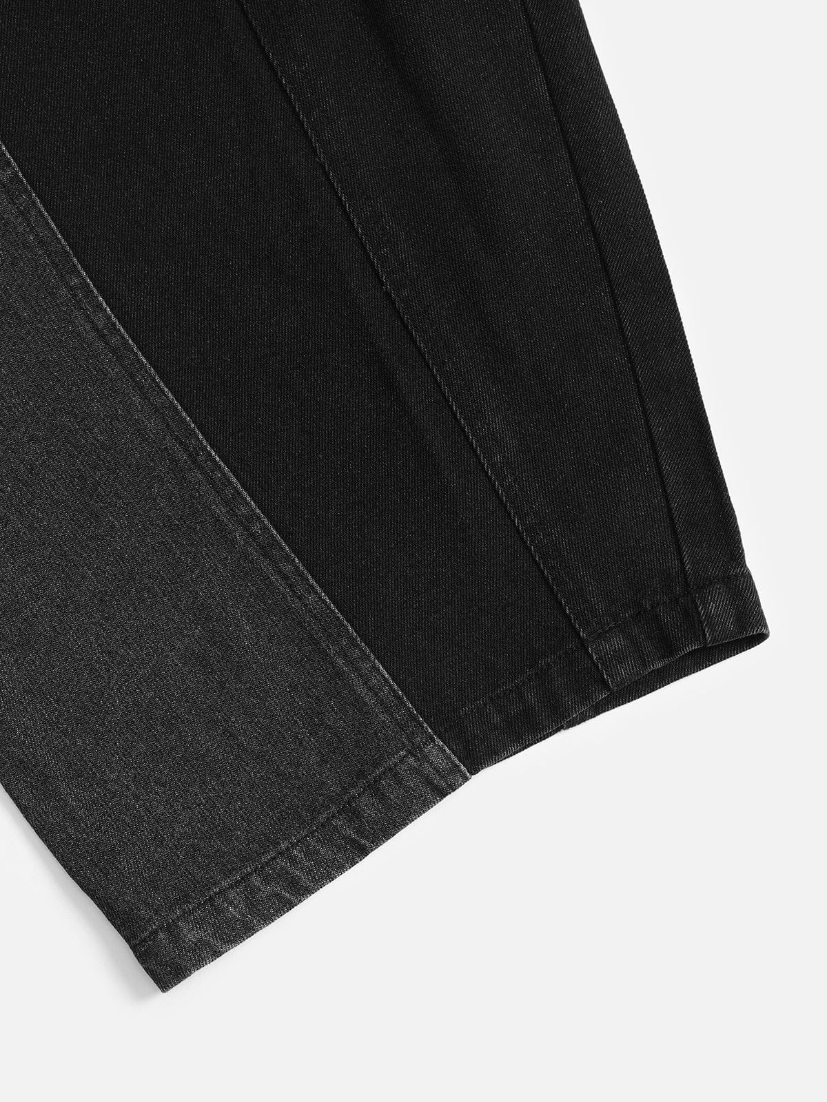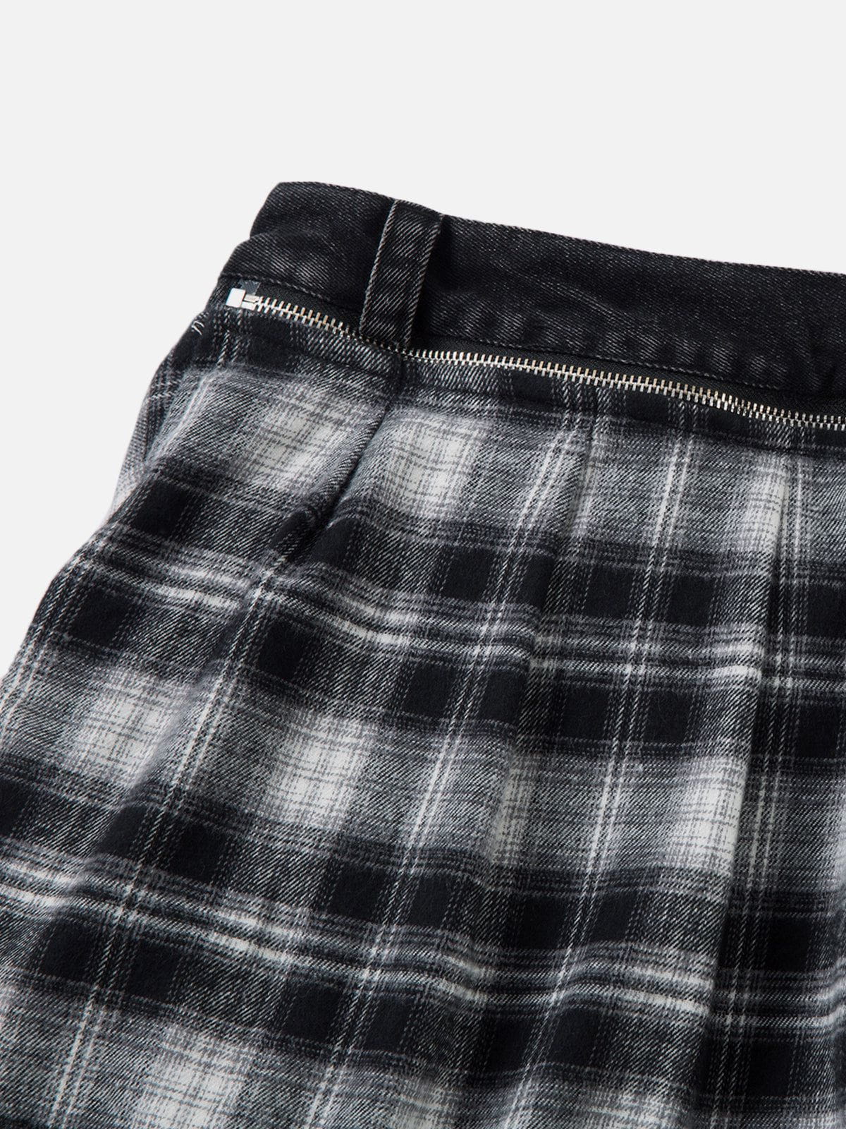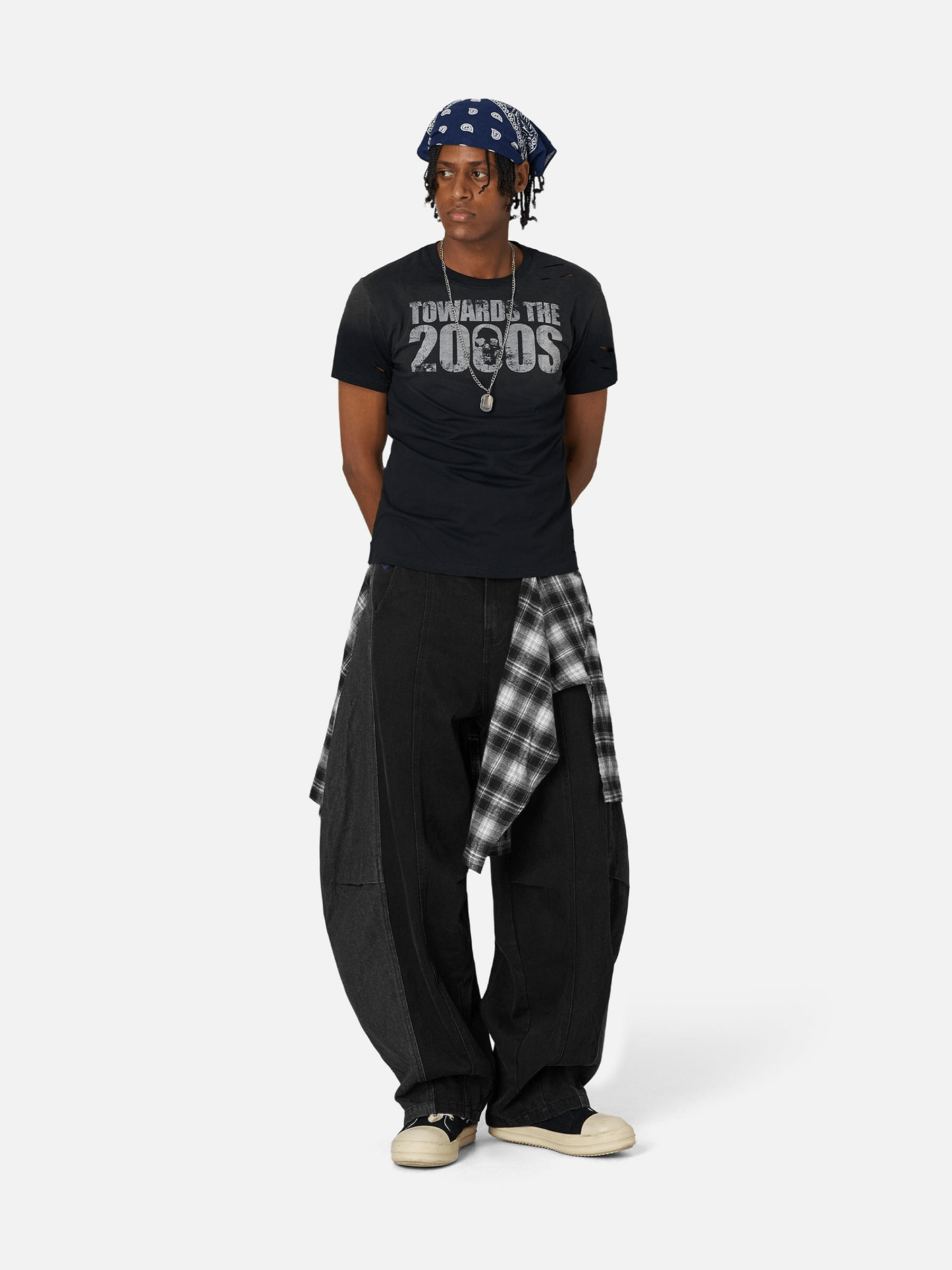 Plaid fabric is cleverly draped across the waist. creating a layered shirt-around-the-hip effect. These super baaggy black jeans blend grunge elements with streetwear volume. offering a bold. deconstructed silhouette from every angle.