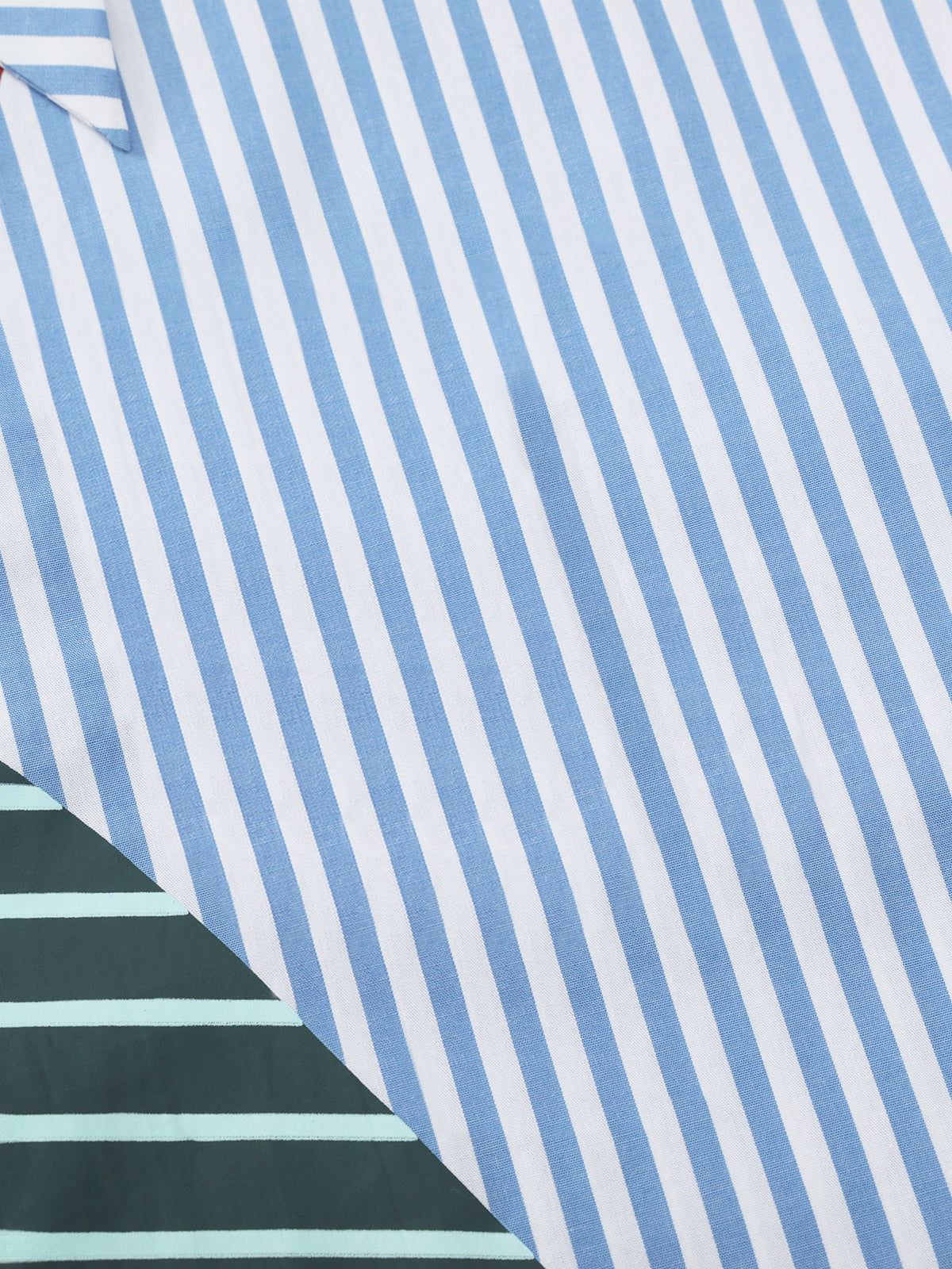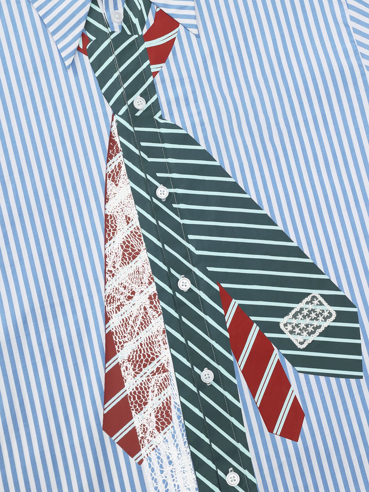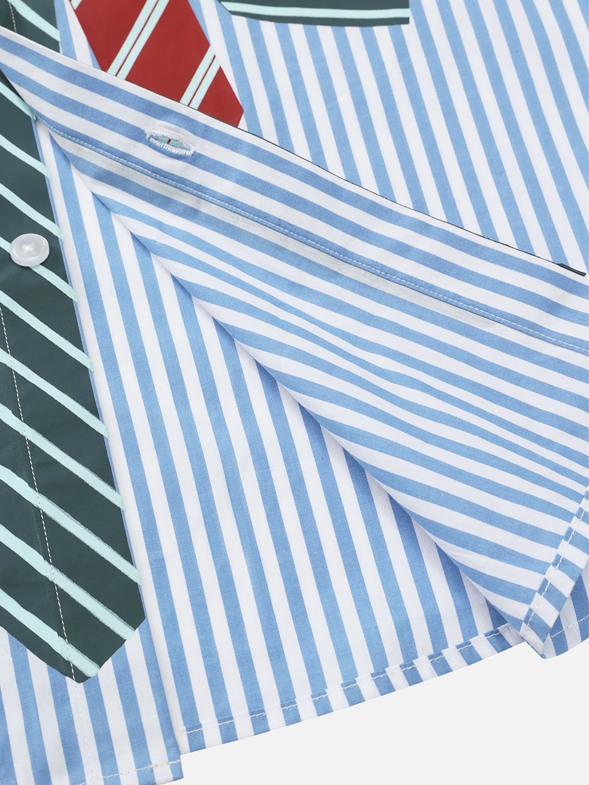 Featuring a unique necktie print and bold stripes. this shirt is perfect for adding a touch of fun to your wardrobe. Stand out from the crowd and make a statement with this playful and stylish piece.