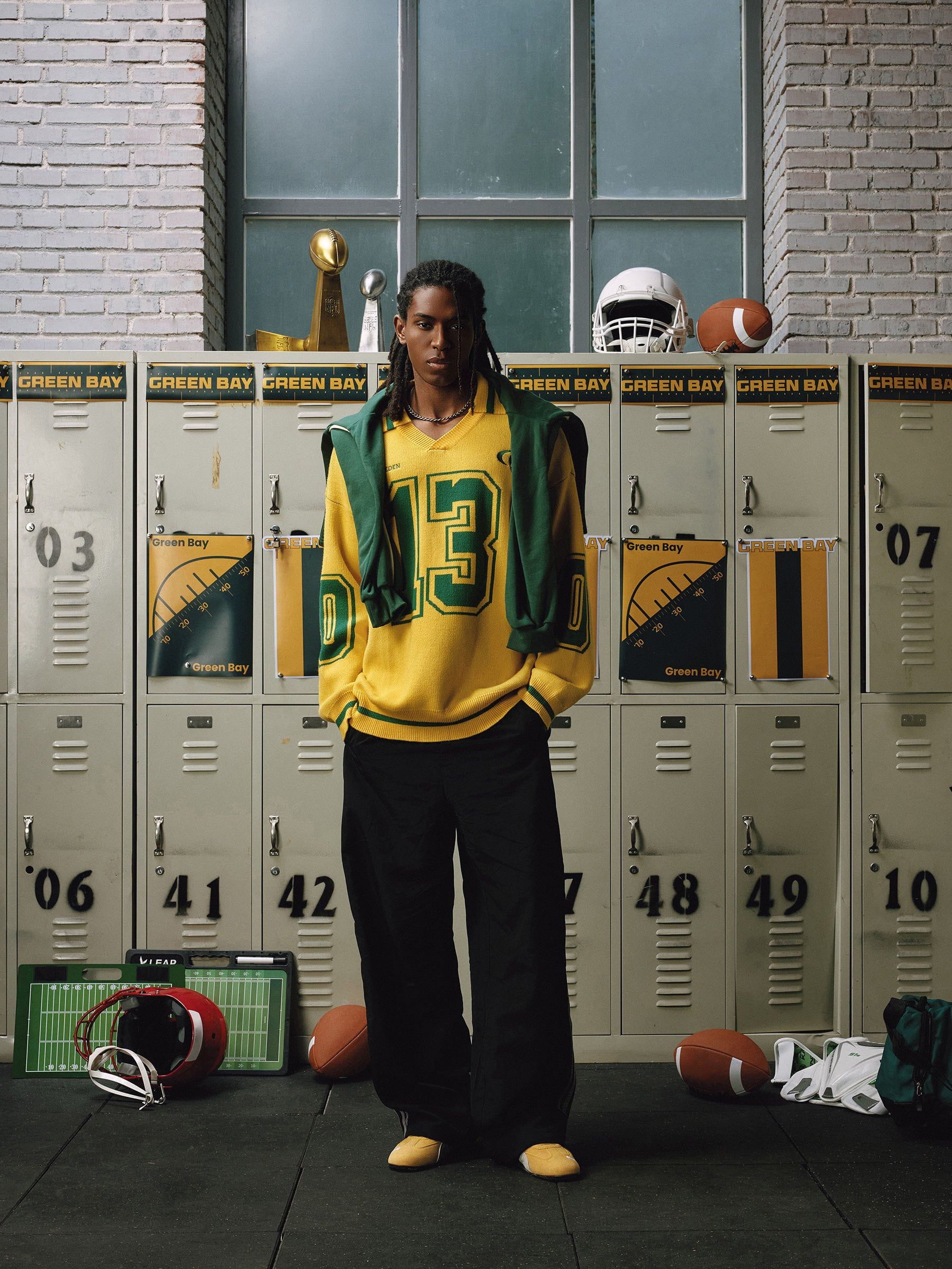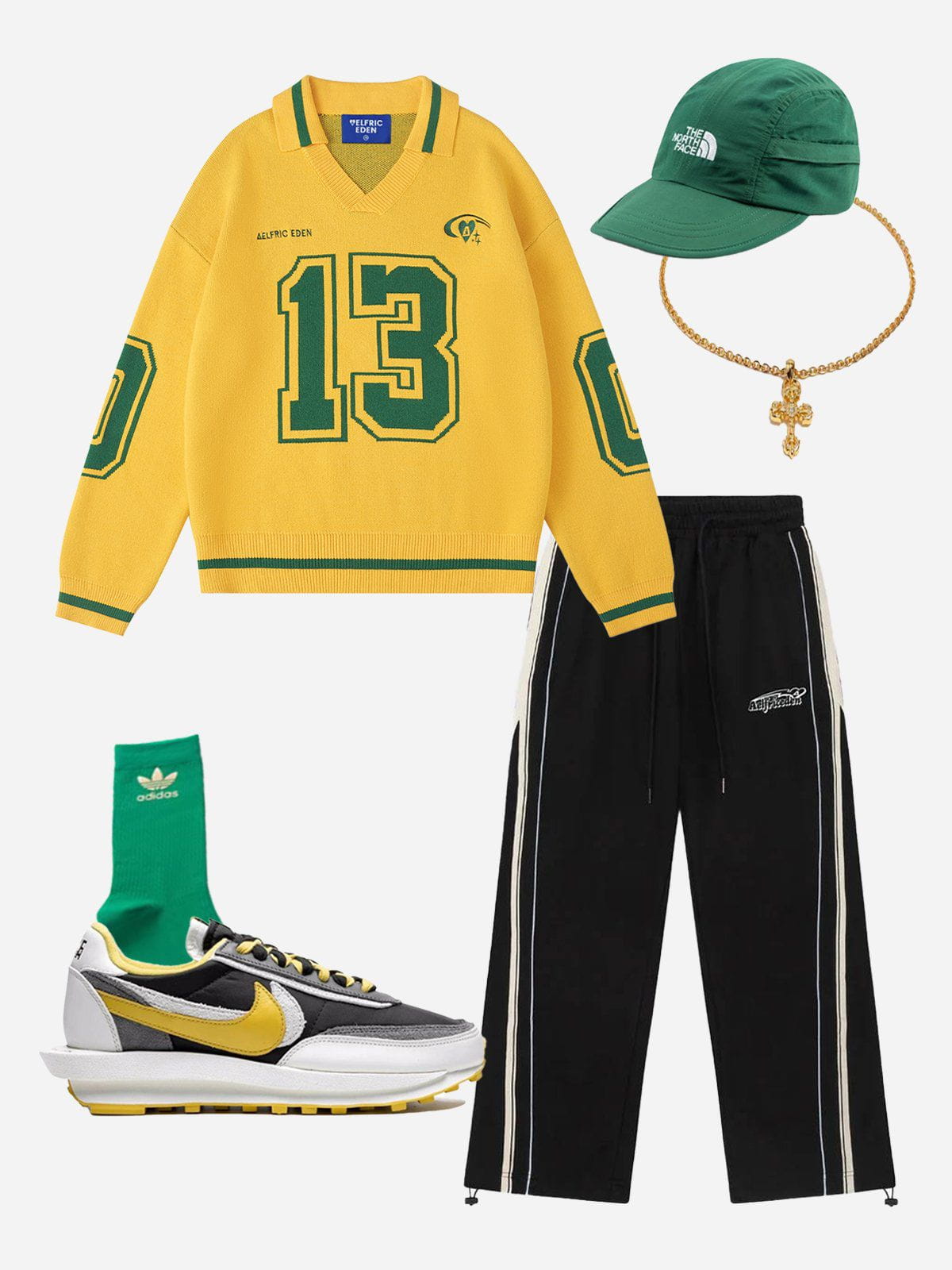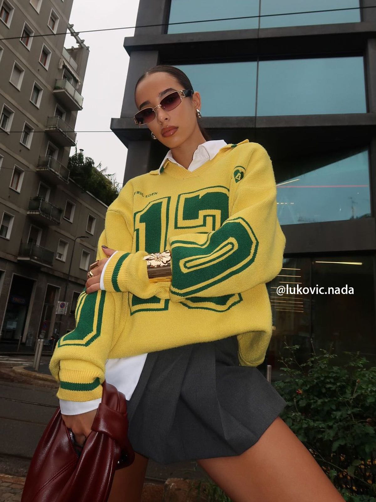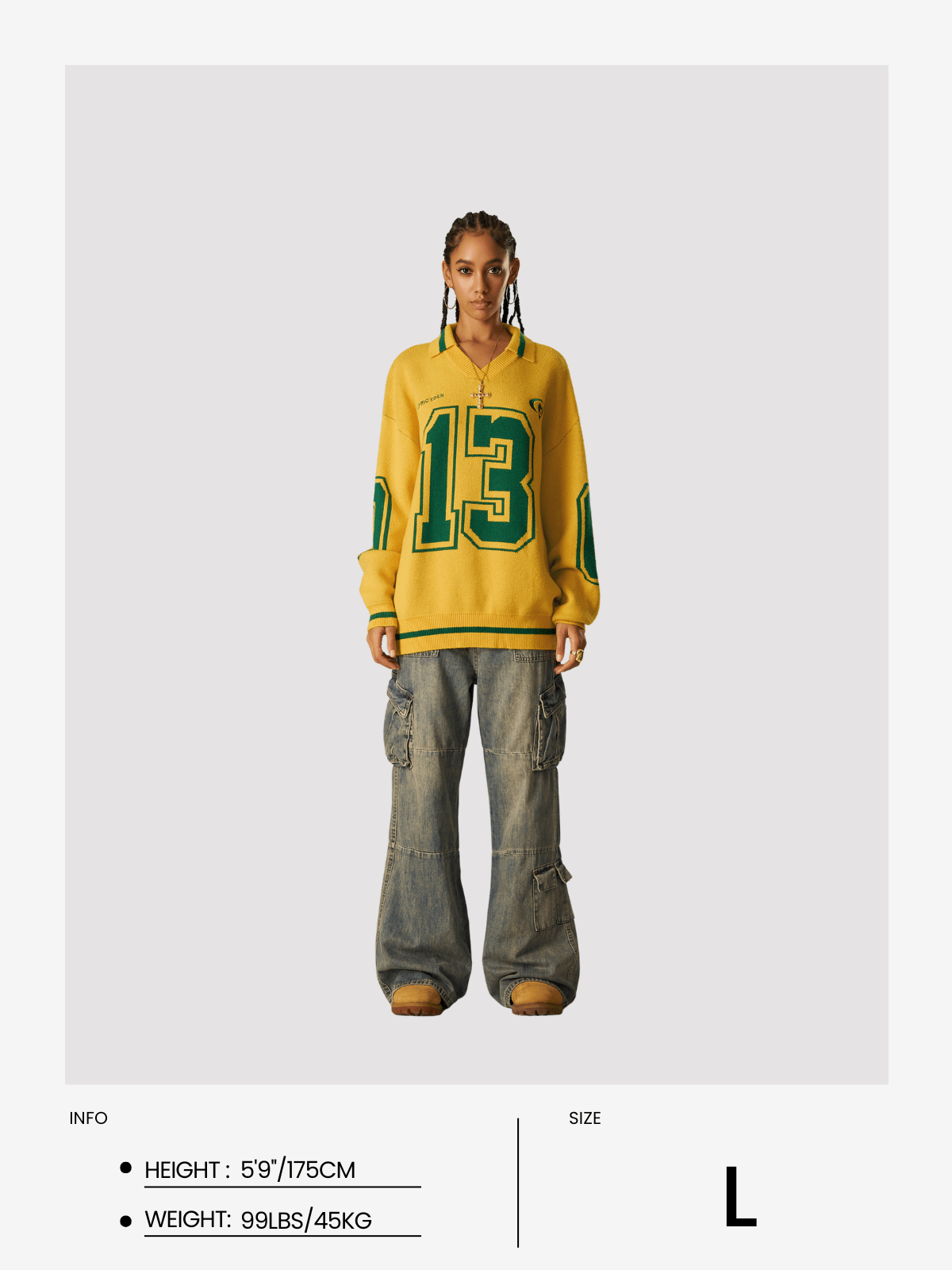 This polo sweater features a distinctive number graphic. blending sporty vibes with a polished look. Crafted with care. it offers both style and comfort in one versatile piece.