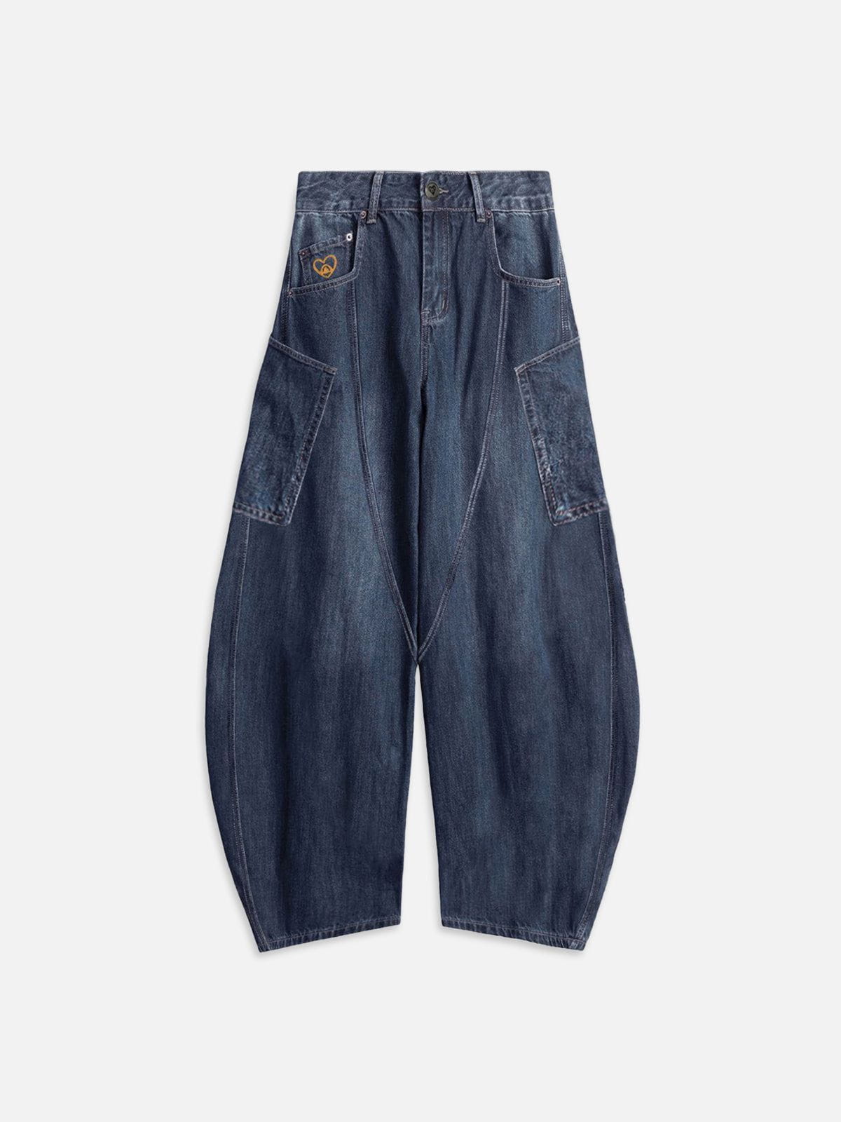 The relaxed barrel fit creates a flattering silhouette while ensuring all-day ease. Featuring statement pockets. including playful faux pocket detailing. these jeans bring a unique and edgy touch to your look.