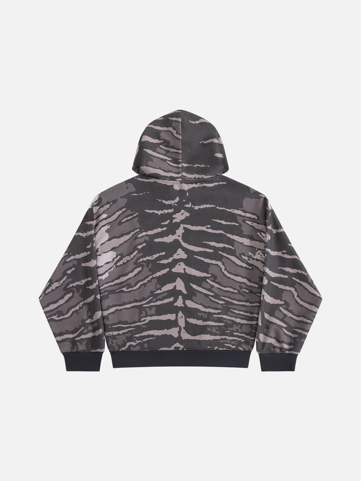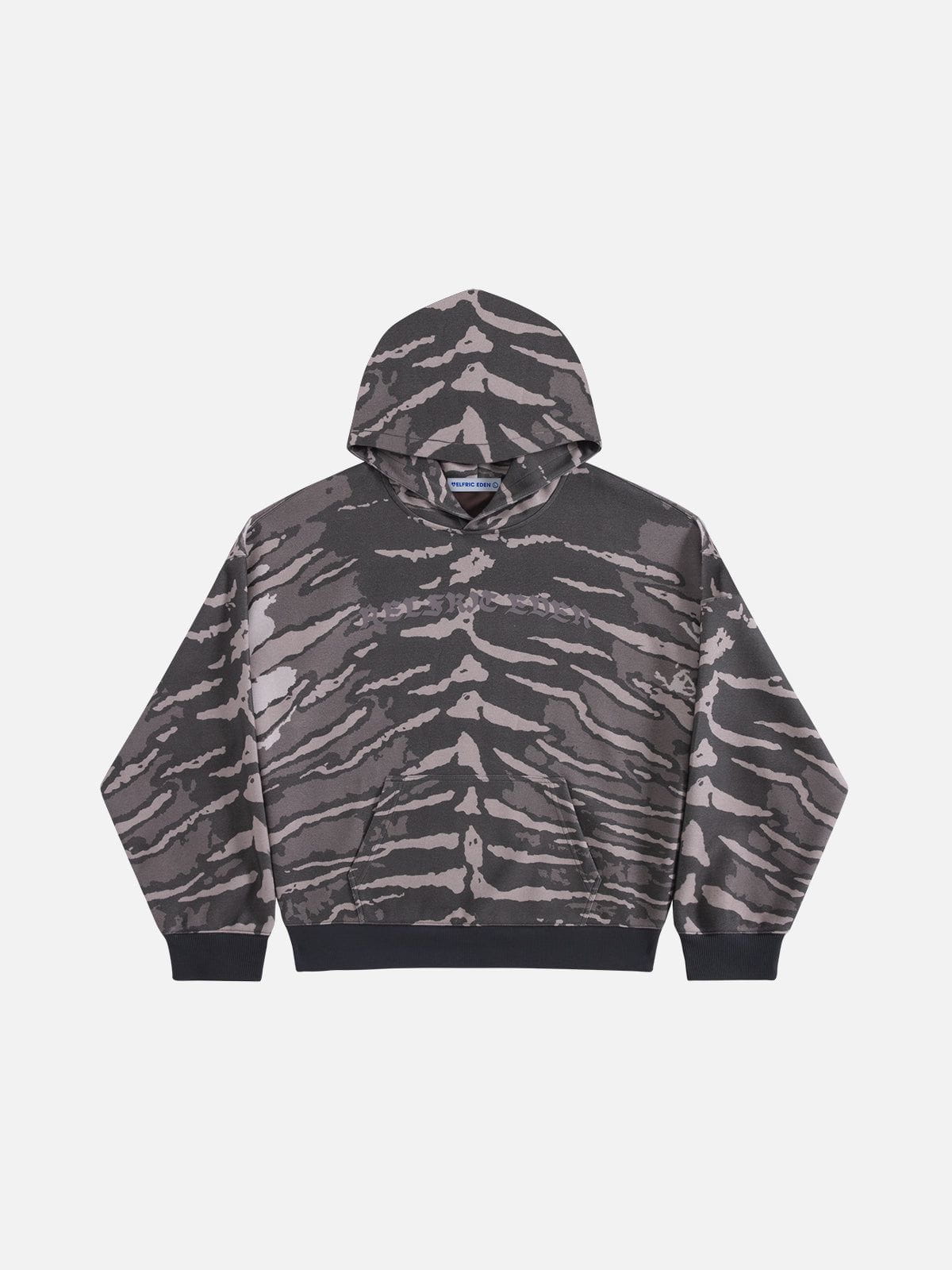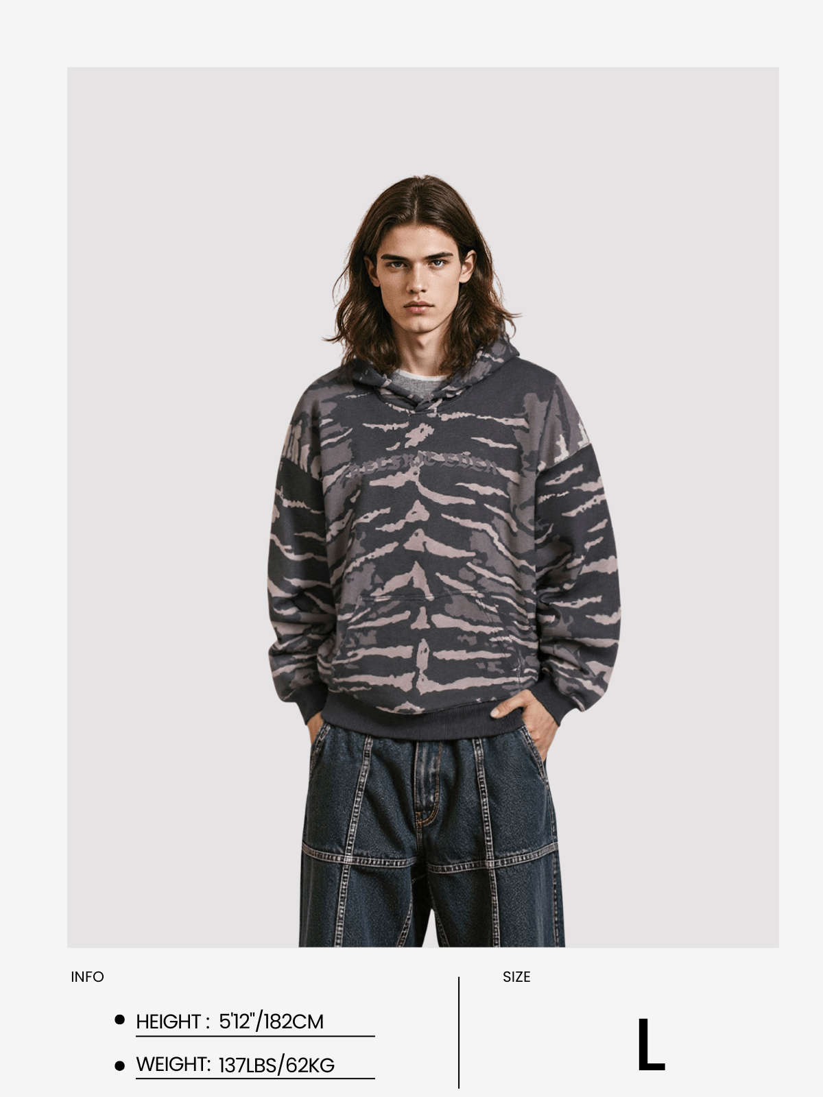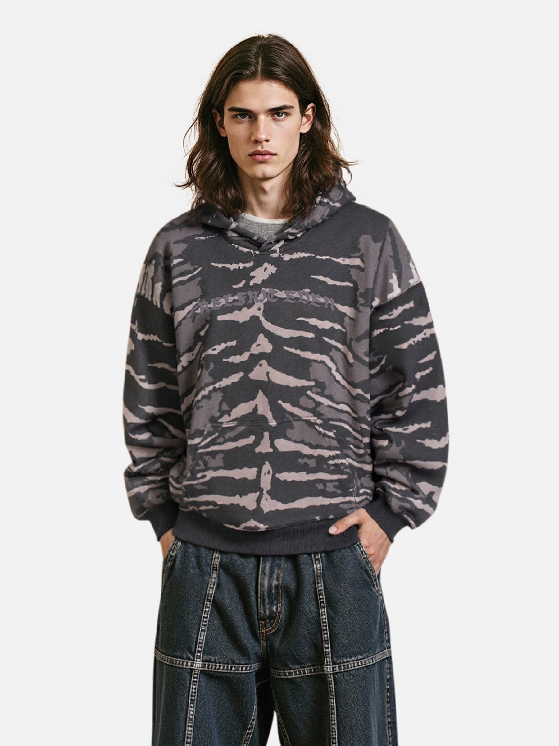 Tiger stripe graphics define the Tiger Stripe Boxy Pullover Hoodie. combining a relaxed boxy silhouette with bold. street-ready style. A statement piece that adds edge to everyday wear.