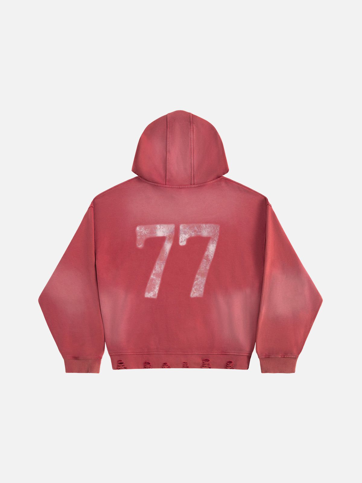 This Rhinestone 77 Graphic Pullover Hoodie features a distressed design paired with a bold 77 print. blending vintage appeal with modern street style. Its unique worn-in look adds character. while the striking print makes a standout statement. Crafted for comfort and durability. this hoodie is perfect for those who want to showcase an edgy. confident attitude with every wear.